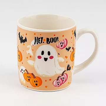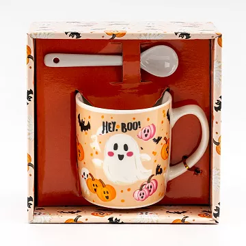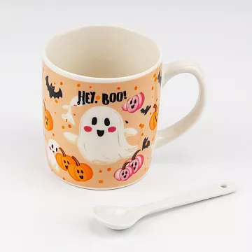 Керамическая чашка с рисунком в виде милого привидения, летучих мышек, хэллоуинских тыкв и надписью "Hey, Boo". К чашке прилагается белая керамическая ложечка. Внешняя и внутренняя часть имеют глянцевое покрытие.