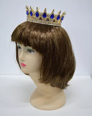 Декоративная металлическая корона золотого цвета, украшенная яркими синими камнями.