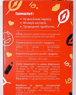- Состав (без сахара): изомальт*, ароматизатор натуральный кола, краситель натуральный пищевой;