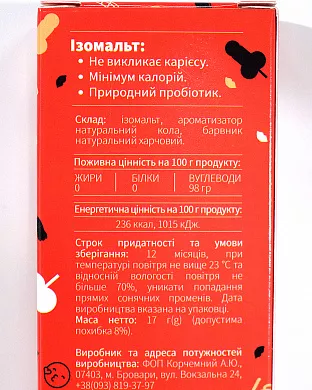- Состав: изомальт, ароматизатор натуральный кола, краситель натуральный пищевой;