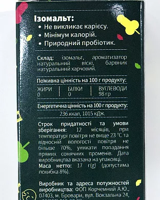 - Состав: изомальт, ароматизатор натуральный виски, краситель натуральный пищевой;