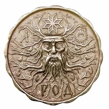 В древнеславянской традиции Род – покровитель рода, предков и судьбы; в отдельных толкованиях – первотворец мира. Монета символизирует непрерывность рода, единство поколений и добрую судьбу, которую Род дарит родившимся и еще нерожденным. Лицо Рода в центре – это знак опеки над домом и потомками, памяти предков. Дерево Жизнь – это олицетворение связи небесного, земного и подземного миров, разрастания семьи и процветания.