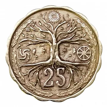 Обратная сторона монеты: стилизованное дерево Жизнь с кроной и корнями; под деревом размещены цифры «25» (формальный номинал); край монеты имеет волнистый, «лепестковый» контур с декоративными кольцами по обводу.