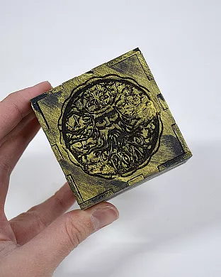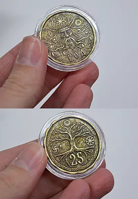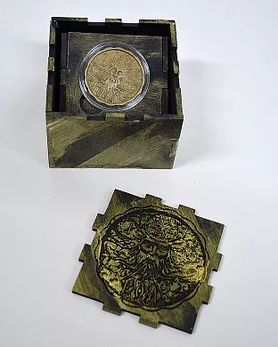 Монета поставляется в стилизованном деревянном ящике, украшенном резным орнаментом. Особенность этой упаковки – она разлагается в форму подиума, на котором монету можно выставить как экспонат или святыню.