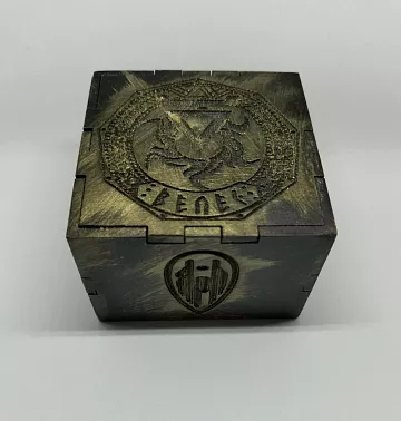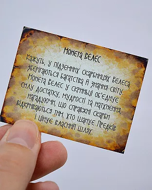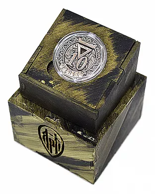 Монета поставляется в стилизованном деревянном ящике, украшенном резным орнаментом. Особенность этой упаковки – она разлагается в форму подиума, на котором монету можно выставить как экспонат или святыню.