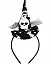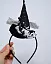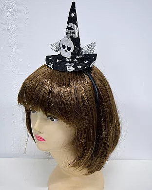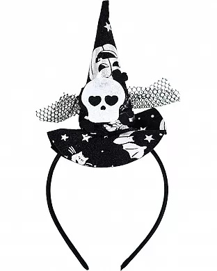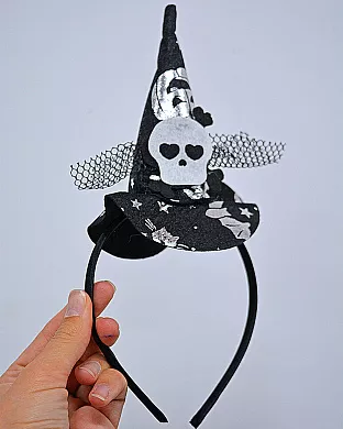 Черная шляпка ведьмы на ободке, украшена белым черепом из фетра и разными хэллоуинскими героями серебряного цвета. Аксессуар отлично дополнит образ ведьмы на тематическую вечеринку и праздник Хэллоуин.