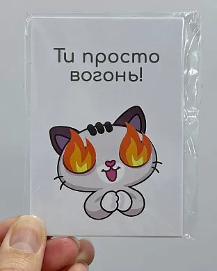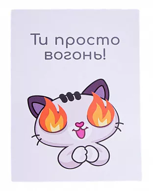 Яркая мини открытка с влюбленным котиком и надписью Ти просто вогонь, станет отличным дополнением к основному подарку или же букету цветов! На обратной стороне открытки можно написать пожелание или послание виновнику торжества, которое точно передаст ваши чувства!