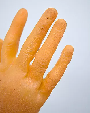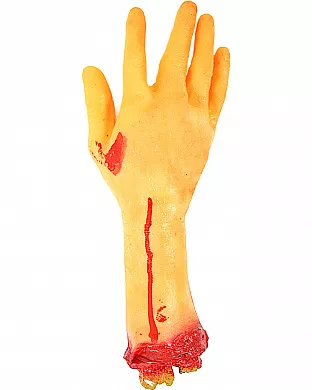 Очень реалистичная резиновая рука с имитацией потеков крови и торчащих костей, прекрасно украсит помещение на Хэллоуин.