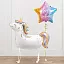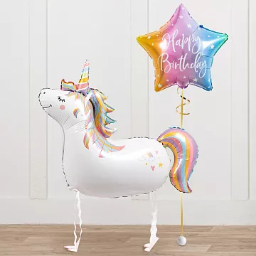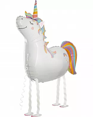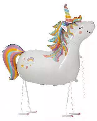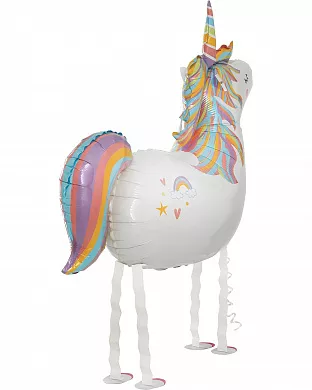 Чтобы фигура "стояла" и "ходила" по полу, единорожку необходимо надувать только гелием. В комплекте присутствуют картонные ножки-грузики, благодаря которым шар не взлетает, а слегка прижимается к земле. Наполненный гелием, он будет выглядеть так, как будто стоит, и вы сможете ходить с ним, используя прикрепленную ленту спереди шара.