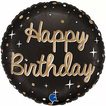 Фольгированный шар в форме круга черного цвета, украшенный звездочками, конфетти и надписью "Happy Birthday". Надувается и гелием, и воздухом (имеет встроенный клапан, который упрощает надув). Фольгированные воздушные шары изготавливаются из тонкой лавсановой пленки, которая позволяет длительное время не сдуваться. Надутый шар Happy Birthdaу отлично подойдет для оформления помещения и создания праздничной атмосферы на тематический день рождения взрослому!