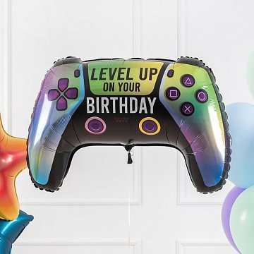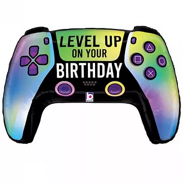 Большой и очень красивый фольгированный шар в виде игрового джойстика с голографическим эффектом и надписью "LEVEL UP ON YOUR BIRTHDAY" (Повышай уровень в свой День Рождения).