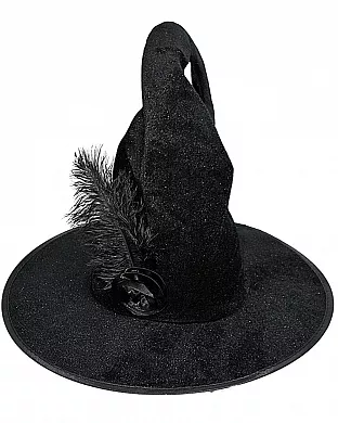 Черный велюровый колпак ведьмы, украшен черной атласной розой и пером. За счет конусообразной формы подойдет на любой размер головы, как подросткам, так и взрослым. Отлично дополнит образ ведьмы на хэллоуинскую вечеринку!