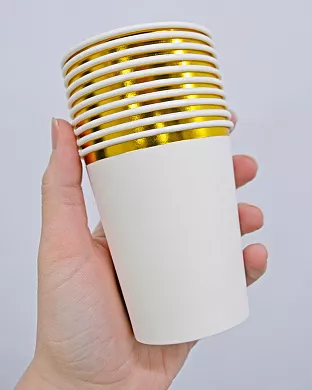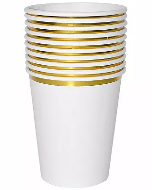 Набор бумажных стаканчиков белого цвета с красивой золотой окантовкой. Такие праздничные одноразовые стаканы для вечеринки станут отличным дополнением к сервировке стола как на взрослый, так и на детский день рождения!