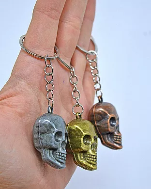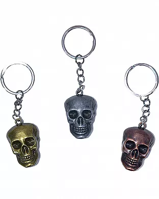 Металевий брелок на металевому кільці-кріпленні, у вигляді об'ємного черепа, у срібному, золотому та бронзовому кольорах. Кольори залежать від постачання товару та можуть бути змінені постачальником.