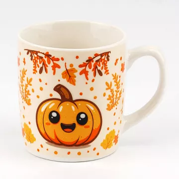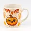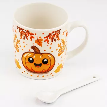 Керамічна чашка з малюнком у вигляді милого гарбуза та осінніх листочків. До чашки додається біла керамічна ложечка. Зовнішня та внутрішня частина мають глянсове покриття.