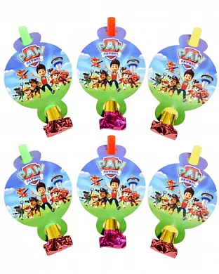 Набір пластикових дудок з фольгованими язичками для тематичної вечірки або дитячого дня народження у стилі Щенячий патруль.