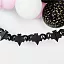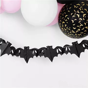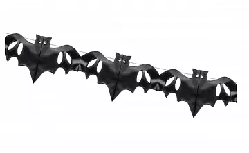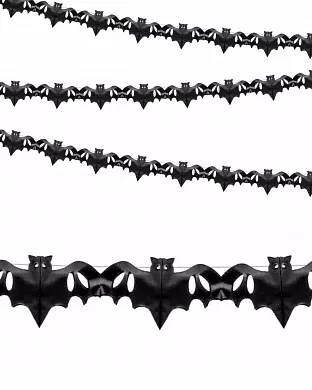 Декорація складається з двошарової паперової гірлянди-розтяжки у вигляді кажанів чорного кольору. Відмінно підійде для оформлення приміщення у стилі Хелловін!
