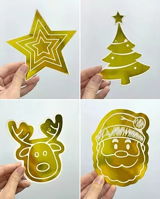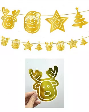 Новорічна гірлянда у вигляді персонажів Нового року, а саме: Санта Клауса, оленя, ялинки та зірочки, виконана в золотому кольорі. Декоративні елементи на гірлянді потрібно самостійно нанизати на стрічку, що додається у комплекті.