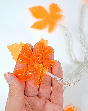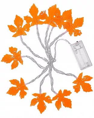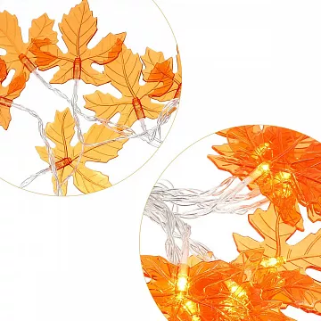 Хеллоуїнська гірлянда Осіннє листя дуже гарно та атмосферно горить у темряві! За допомогою цієї гірлянди ви з легкістю зможете прикрасити як на хеллоуїнське свято ваш стіл, вікна, стіни та будь-який інший предмет у приміщенні, так і на свято осені або ж 1 вересня!