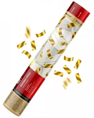 Пневматична хлопавка підходить для використання у приміщенні та на вулиці. Вистрілює фольгованим прямокутним конфетті золотого кольору.