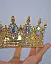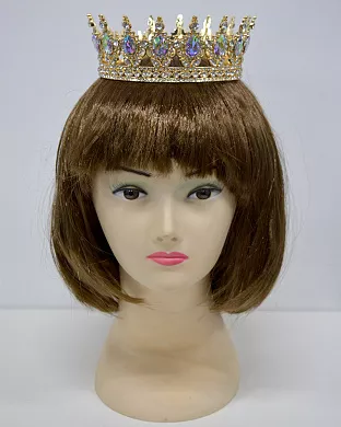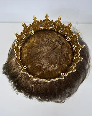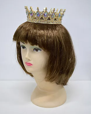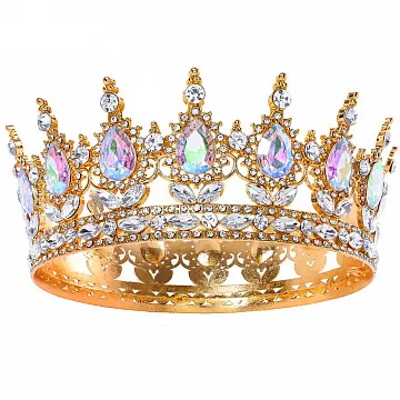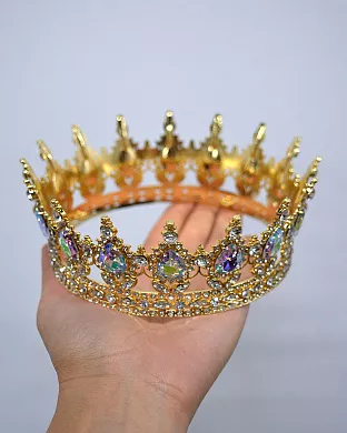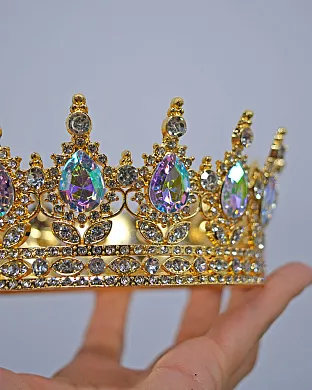 Декоративна металева корона золотого кольору, прикрашена білим камінням, яке при попаданні світла на них - переливається різними кольорами.