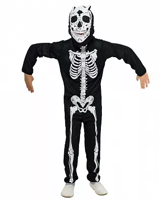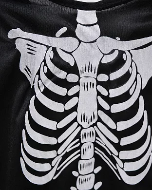 Дитячий костюм скелета, що підійде як для хлопчика, так і для дівчинки. Костюм прикрашений принтом у вигляді кісточок скелета, а маска оформлена у вигляді черепа. Такий костюм скелета для дитини відмінно підійде на тематичну вечірку або костюмоване свято Хелловін!