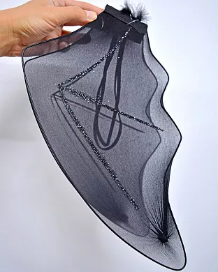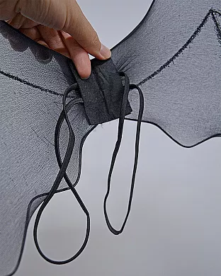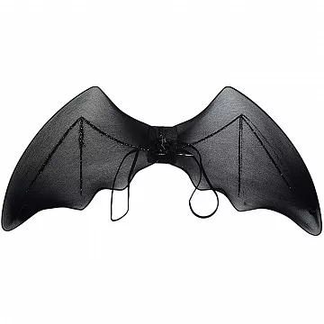 Дитячы крила кажана чорного кольору, прикрашені чорними блискітками та пухом. За рахунок резинок крила дуже зручно кріпляться на плечах, а вставлена всередині проволока забезпечує будь-яке потрібне положення.