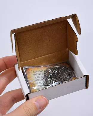Кулон поставляється в стилізованій картонній коробочці, всередині якої - вкладиш та пакетик з кулоном та ланцюжком.