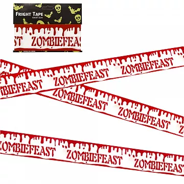 Огороджувальна стрічка білого кольору із кривавим написом "Zombiefeast" (свято зомби) червоного кольору. Відмінний декор на хеллоуїнську вечірку в стилі кривавої різанини чи зомбі апокаліпсису!