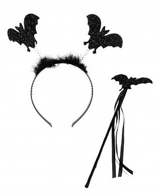 Яскравий набір для образу милого кажана. Набір складається з пластикового обруча, прикрашеного пухом і ріжками з кажанами і чарівної палички з летючою мишкою та стрічками. Набір Кажан - красивий аксесуар, який доповнить образ принцеси кажанів на тематичну вечірку або костюмоване свято на Хелловін!