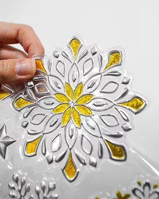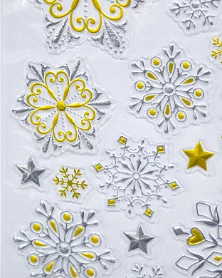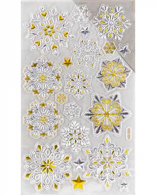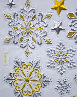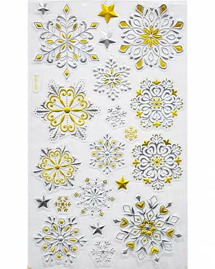 Набір наклейок на вікно або будь-яку іншу поверхню у вигляді сніжинок та зірочок. Наклейки мають клейку основу, а за рахунок своєї об'ємності досить добре тримаються і знімаються. Діаметр сніжинок варіюється від 2.5 см до 11 см.