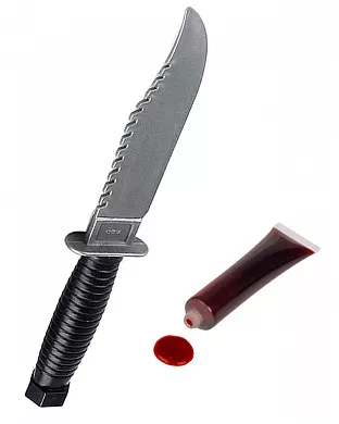 Бутафорний пластиковий ніж в комплекті з тюбиком штучної крові. Ніж виглядає дуже реалістично, але при цьому виготовлений з пластику і тому він досить легкий. За допомогою штучної крові ви зможете додати хоррору у свій образ на Хелловін, а також, декорувати ніж, щоб імітувати на ньому жахливі сліди від крові!