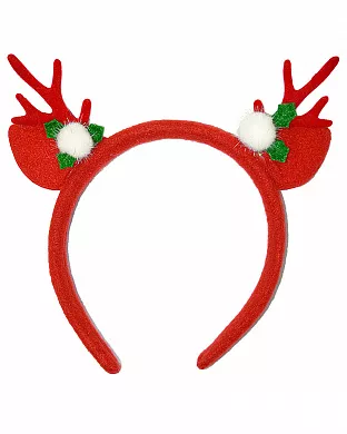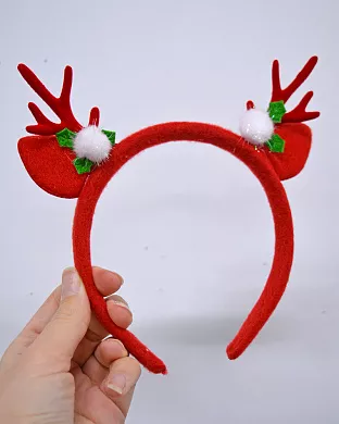 Обруч з вушками, червоними ріжками оленя та білими бубонцями. Основа обруча з пластику, обтягнута червоною тканиною. Аксесуар для створення яскравого образу та святкової новорічної атмосфери у період зимових свят!