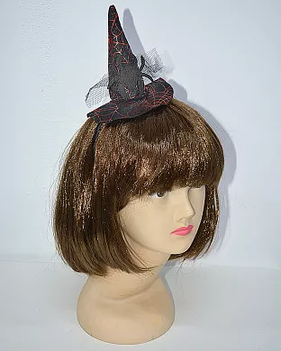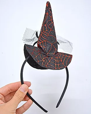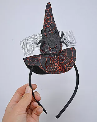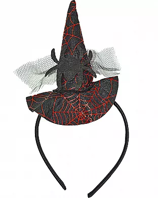 Чорний капелюшок відьми на обідку, прикрашений чорним павуком з фетру та червоною павутинкою. Аксесуар чудово доповнить образ відьми на тематичну вечірку та свято Хелловін.