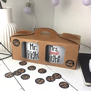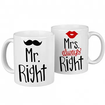 Парні керамічні чашки на подарунок парі або своїй другій половинці. Одна чашка для чоловіка з написом Mr. Right (Містер Завжди правий), а інша для жінки, з написом Mrs. Always Right (Місіс Завжди права). Такі чашки будуть чудовим подарунком на День усіх закоханих, а також, як миле доповнення до подарунка на день народження або просто як прояв любові та уваги близькій людині!