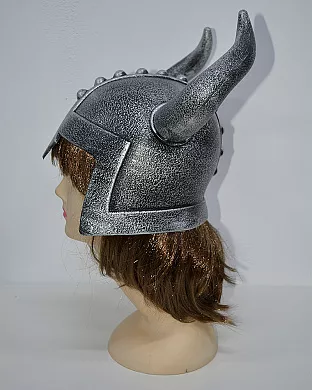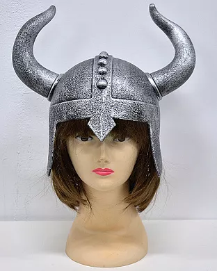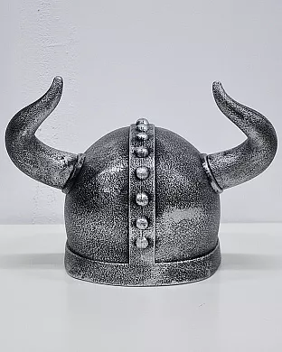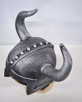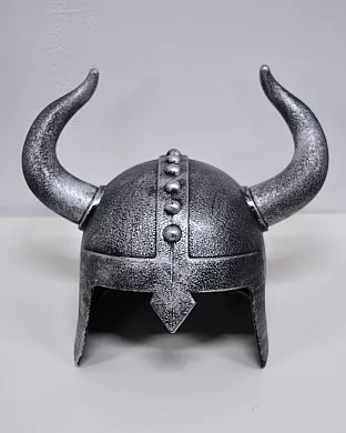 Пластиковий шолом чорно-срібного кольору із рогами, зроблений під потертий метал. Посередині шолом оздоблений декоративним захистом на ніс. Аксесуар ідеально доповнить образ вікінгу для тематичної вечірки чи костюмованого свята!