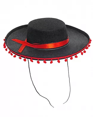 Чорне сомбреро Іспанія з фетру, декороване червоною стрічкою та бубонцями. Капелюх іспанця - оригінальний атрибут для мексиканської вечірки чи костюмованого свята!