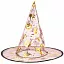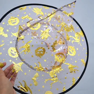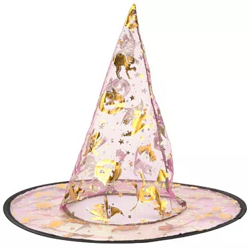 Напівпрозорий ковпак відьми рожевого ввіддінку кольору із золотим принтом у вигляді зірок, гарбуза, кота та відьми. Поля капелюха натягнуті на дріт і добре тримають форму. Аксесуар чудово доповнить образ відьми як дорослого, так і дитини на тематичну вечірку та свято Хелловін.