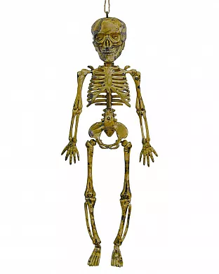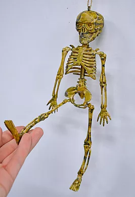 Прикольний підвісний декор у вигляді скелета ідеально прикрасить приміщення на вечірку в стилі Halloween. Скелет підвішується за мотузку (є в комплекті) або його можна посадити, оскільки ноги у нього рухаються.