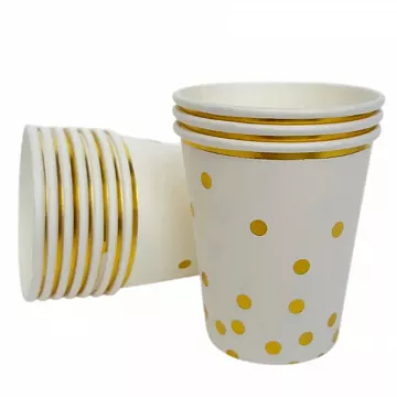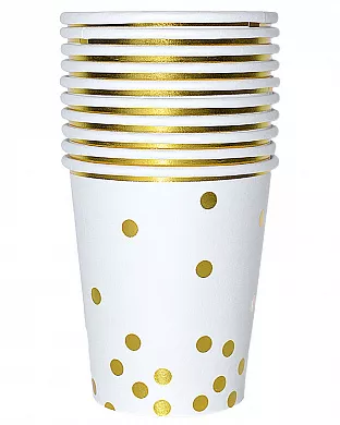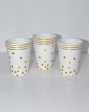 Набір білих паперових стаканчиків з принтом у вигляді золотого конфетті. Відмінно підійде для сервірування святкового столу на будь-яку дорослу вечірку або стильний дитячий день народження!