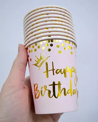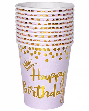 Набір паперових стаканчиків рожевого кольору із золотим принтом у вигляді корон принцес, чарівних паличок та сердець. Такі святкові одноразові стаканчики стануть чудовим доповненням до сервірування столу на день народження у стилі принцеси, феї або як посуд на перший день народження дівчинки!