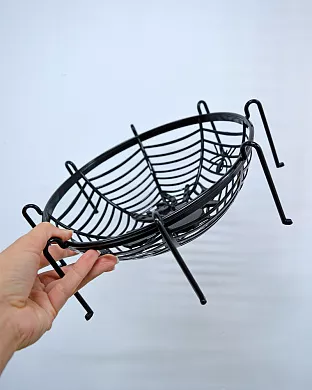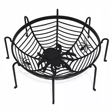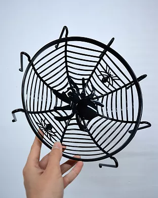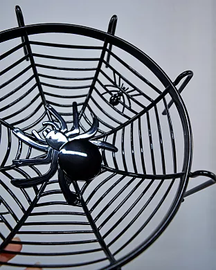 Глибока тарілка із щільного пластику, виконана у вигляді павутиння чорного кольору та декорована двома павуками та павуковими лапками.