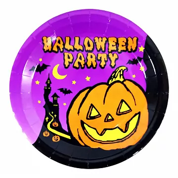 Набір паперових тарілок яскраво-фіолетового кольору з написом Halloween Party і принтом у вигляді хеллоуїнських персонажів та гарбуза Джек. Такі тарілки відмінно підійдуть для сервірування столу на вечірку Хелловін!