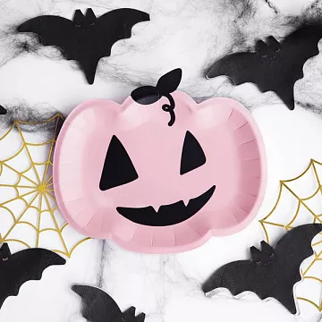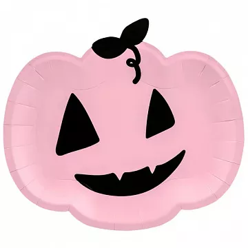 Набір паперових тарілок на Хелловін, ніжно-рожевого кольору з принтом у вигляді мордочки хеловінського гарбуз. Чудово підійде для сервірування столу на вечірку Halloween!