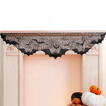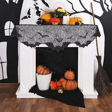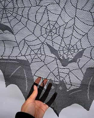 Декорація у вигляді ажурної тканини чорного кольору з малюнком павутини та кажанів на ній. Полотно з павутиною - відмінний елемент як декору приміщення на Хелловін, яким можна прикрасити будь-яку зону в будинку, офісі, магазині або кав'ярні! Так і за рахунок своєї форми її можна використовувати як аксесуар для образу відьми або чорної вдови замість шалі!